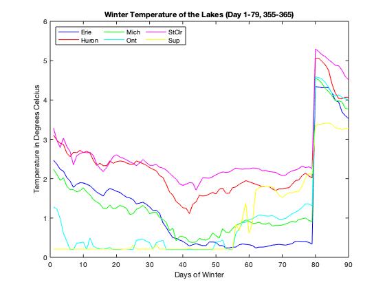 The graph that we chose as our favourite is the graph that shows the winter temperature of each lake from day 1 to 79, and day 355-365. The graph shows the how the temperature of the water changes as the year goes on in the winter season. An element of a excellent graph is having the dat be clear a concise. This is shown in our graph by the different colours of the lines that represent the temperature of each lake as the season goes on. The way that the colours intertwine and show the relation between the lakes is one reason why we like this graph. Another reason why we like this graph is that the graph shows the trend of the lake temperature across the year. One of the main aspects of our graph is the straight slope of the graph at day 79. This is because at day 80, the season changes to spring thus, it the end of winter. The graph continues as winter returns closer to the end of the year. During this break we can see that the temperature rises just by the change of slope. When winter begins again, we can see how much the temperature changes over the rest of the year. Due to this main feature of the graph, it places our pick as our favourite graph.